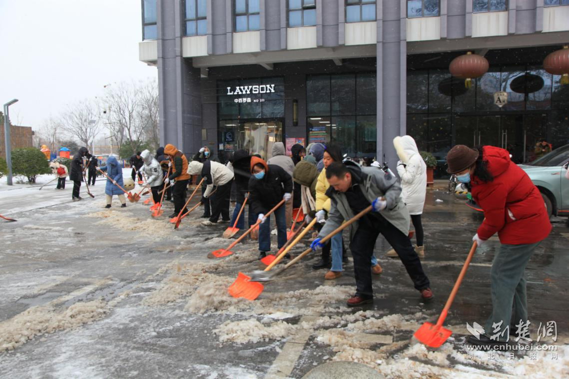 在黃陂區(qū)灄口、前川街道,街道綜合執(zhí)法中心通過“線上通知+線下走訪”的方式,強(qiáng)化沿街商戶“門前三包”責(zé)任制落實;在新洲區(qū)摩爾城、幸福時代等人員密集的商圈周邊道路,摩爾城商戶、周邊居民都在區(qū)城管執(zhí)法局清雪工作人員的感染下,自覺加入掃雪隊伍;在東湖風(fēng)景區(qū),執(zhí)法人員向沿街商戶發(fā)放《致全體武漢市民的掃雪除冰倡議書》,沿街商戶紛紛響應(yīng)“門前三包”責(zé)任,拿起工具主動清理門前積雪,形成了“各掃門前雪,共護(hù)出行路”的自覺氛圍;在蔡甸區(qū),蔡甸自來水公司自發(fā)組織干部職工,在公園路—樹藩大街包保路段開展鏟雪除冰工作,及時消除道路通行隱患。