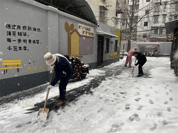 一大早,三名居民志愿者便率先行動(dòng),有人清掃路面浮雪,有人揮舞鐵鍬鏟除薄冰,還有人主動(dòng)疏導(dǎo)過往居民,提醒大家小心路滑。在志愿者的帶動(dòng)下,越來越多居民走出家門加入掃雪隊(duì)伍,原本寂靜的小院變得熱鬧起來,歡聲笑語驅(qū)散了冬日寒意,鄰里距離也在并肩勞動(dòng)中悄然拉近。社區(qū)工作人員帶著掃雪工具趕來時(shí),正撞見熱火朝天的勞動(dòng)場景,隨即也加入掃雪行列。