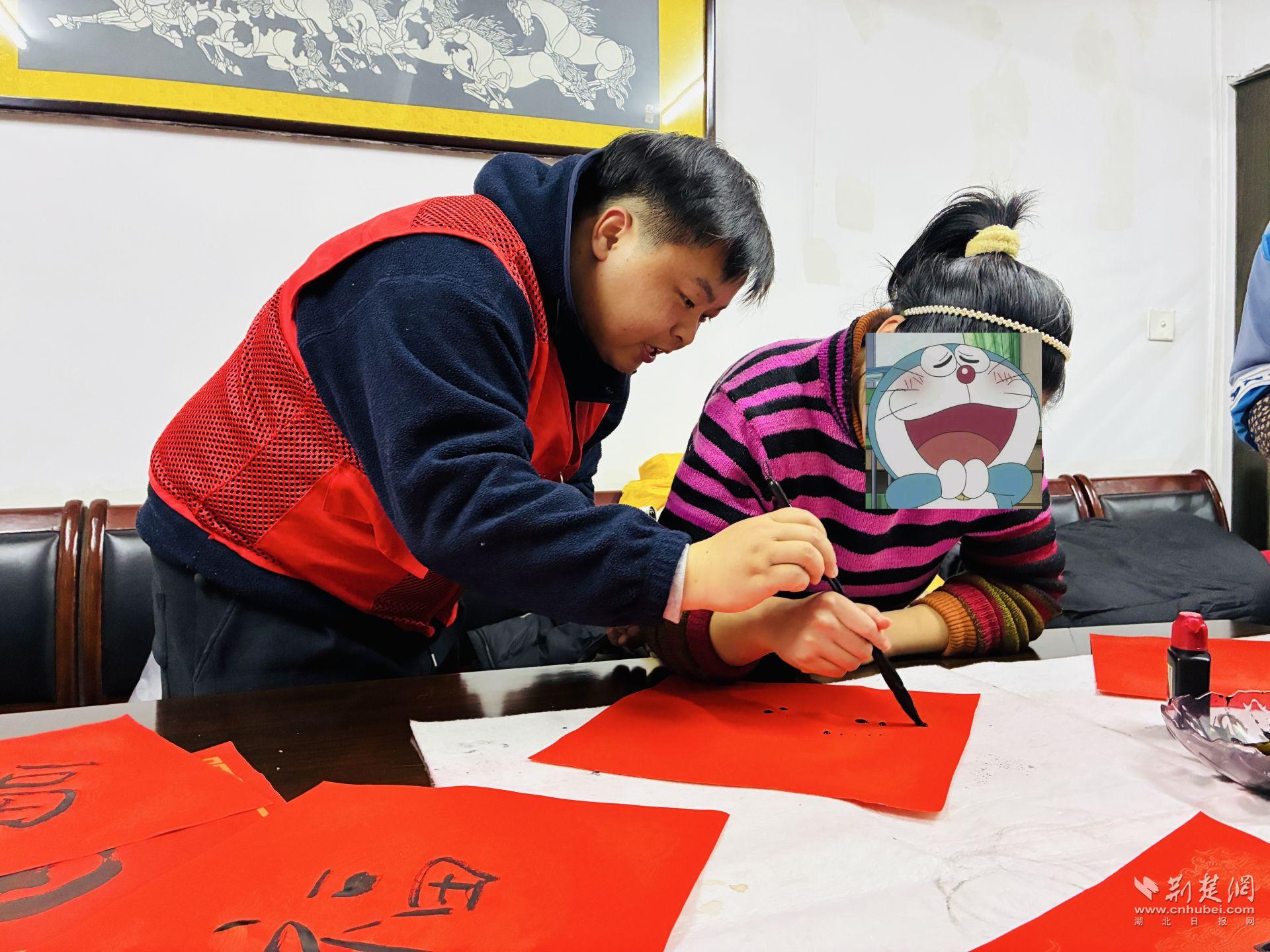 活動現(xiàn)場還設(shè)置了春聯(lián)書寫互動區(qū)。書法老師從握筆姿勢、用筆力度講起,耐心示范基礎(chǔ)筆法,并根據(jù)每個人的情況進(jìn)行指導(dǎo)。筆墨鋪展間,一副副春聯(lián)逐漸成形,內(nèi)容樸實真切,寄托著對新一年的期望。
