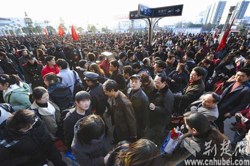 記者今日上午到武昌站轉了轉,和春節(jié)幾天相比,站前廣場的客流明顯增多,幾趟臨客的發(fā)車招牌豎在廣場上,到點會有引導員引導旅客依次進站?梢哉f是忙亂中仍然井然有序。據(jù)了解,昨天,鐵路春運客流出現(xiàn)新高潮,武漢鐵路局共發(fā)送旅客51.14萬,再創(chuàng)歷史新高,旅客發(fā)送量約占全國鐵路旅客發(fā)送量的十分之一。