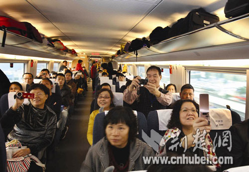 荊楚網(wǎng)消息 (楚天金報記者譚新杰 通訊員郭金富、劉強(qiáng))12月26日上午9時,三列嶄新的時速350公里“和諧號”高速列車從武漢站、長沙站和廣州北站同時首發(fā),標(biāo)志著目前世界上運(yùn)營速度最快、一次性建成里程最長的高鐵新干線——武廣客專正式投入運(yùn)營!瓣懙仫w行下廣州,千里南國一日還”的時代已經(jīng)到來。