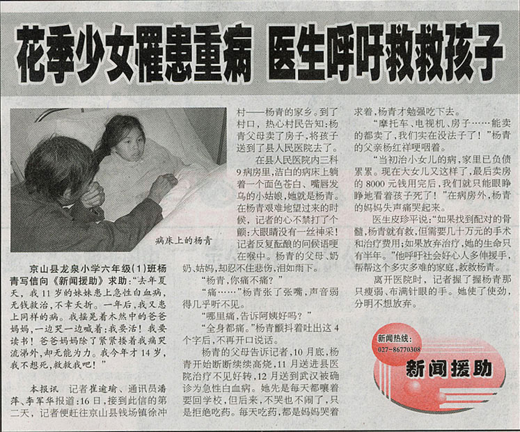 京山縣一對先后患上急性白血病的少女,妹妹已于一年前不幸夭折,姐姐楊青在死亡線上苦苦掙扎。父母為治療姐妹倆的病,花光了所有積蓄,仍不能湊夠移植骨髓所需的幾十萬元手術(shù)和治療費(fèi)用,已經(jīng)陷入絕望。但是,才14歲的楊青不肯向悲慘的命運(yùn)妥協(xié),她寫信給報社:“我不想死,我要讀書,救救我吧!”