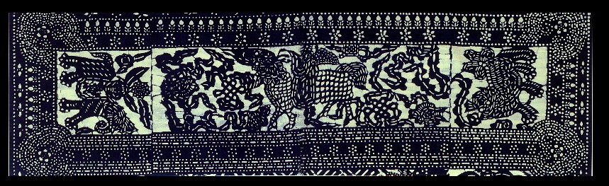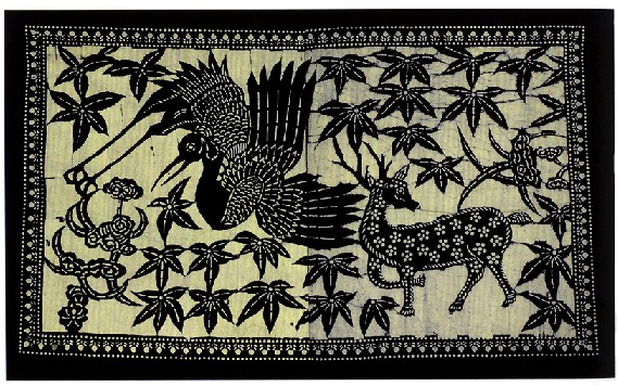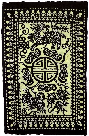 藍(lán)印花布遍及湖北全省,尤以天門藍(lán)印花布最負(fù)盛名。其特點(diǎn):1、藍(lán)與白的選擇,藍(lán)白兩色并非吉祥色,然而經(jīng)過藝人們的巧妙的藝術(shù)處理,使人感到清新明快;2、虛與實(shí)的結(jié)合:以點(diǎn)組成線,以線組成面,若合若離,似為一體,實(shí)又分離。